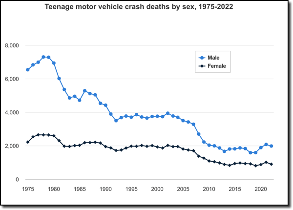 In 2022, 2,883 teens aged 13–19 died in vehicle crashes. That’s a huge improvement from 1975, but still far too high. Two out of three of those teens were male. And while both male and female teen deaths have declined since the 1970s, teen boys continue to be involved in fatal crashes at a higher rate.