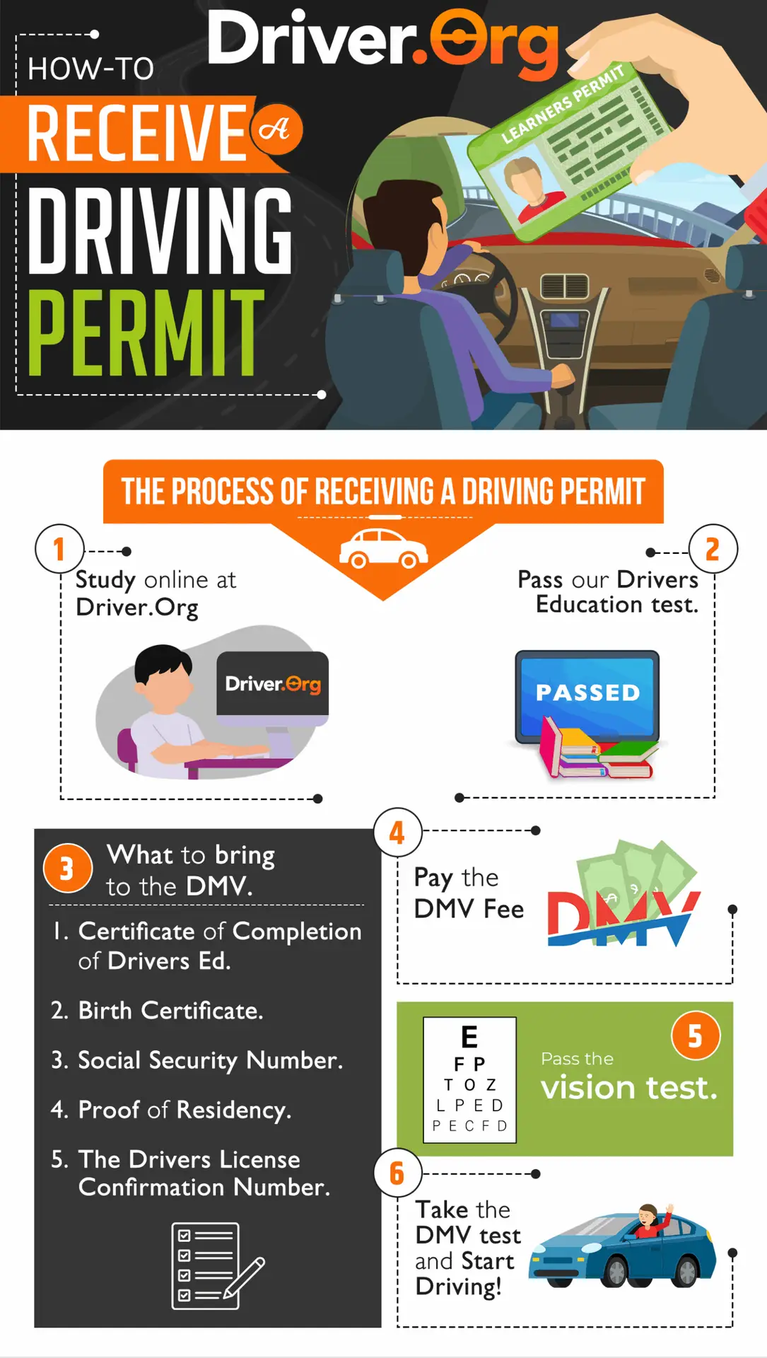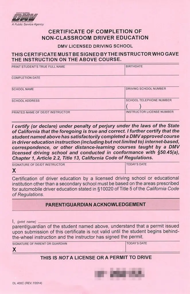 To earn your California provisional instruction permit, any minor must have completed a DMV approved driver education course, like Driver.org, and have received your Pink DMV Certificate of Completion of Driver Education – DL400C.